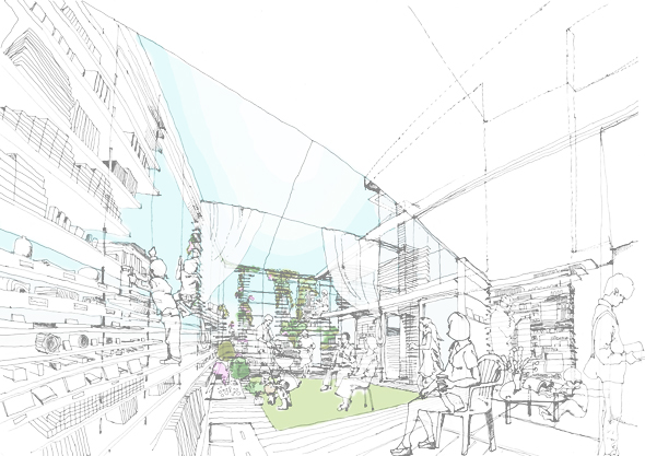 壁は鉄筋の芯材をガイドにして規格材を積層させる。その壁は建築物の架構の一部であると同時に、場所に応じて寸法を変え、日除け、通風、目隠し、棚、家具などにする。規格材は着脱して部分更新が可能であり、物の配置、住み方による模様替えや、経年使用による修理交換を行うことができるようにする。