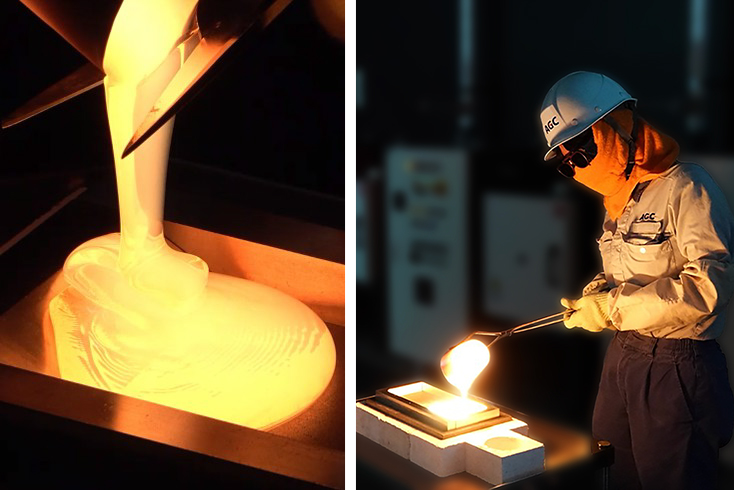 ガラスは主成分となるシリカを多く含む珪砂という石英質の砂を高温で溶かして作られます。最近はマインクラフトといったゲームを通して子供たちにも砂が原料であることが知られているみたいですね。普段私たちが知っている高い温度はコロッケや天ぷらを揚げるときの180℃、せいぜいオーブンでグラタンを焼く250℃というところでしょうか。砂はこのレベルの温度ではびくともせず、約1600℃の高温の窯で溶かされます。これでも建築用や自動車用で使われる板ガラスは、テレビなどで使われるディスプレイのガラスよりは溶けやすいようにソーダ灰を混ぜて融点を下げています。
