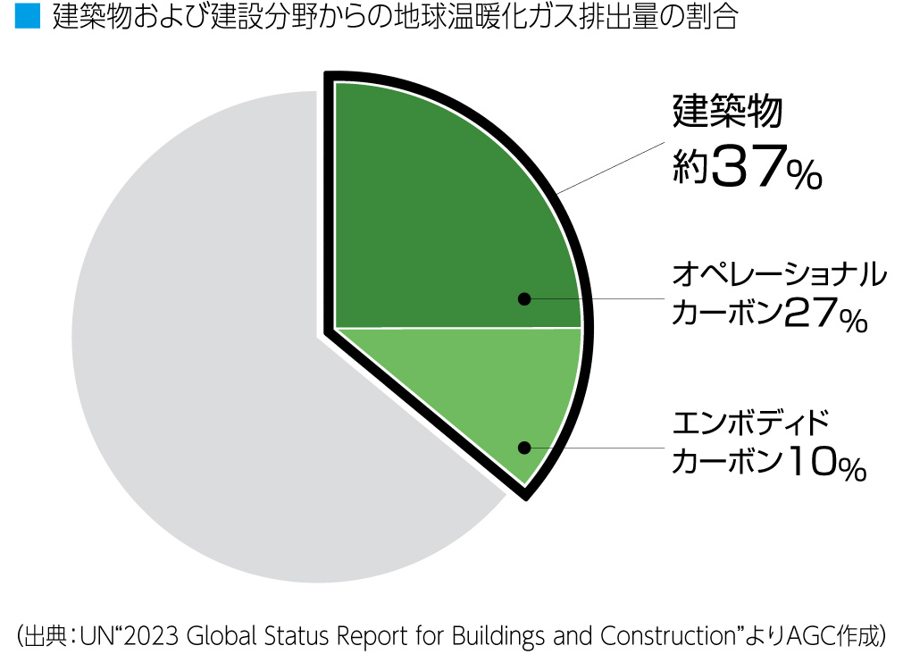 冷暖房のエネルギー負荷は、窓や壁の断熱・遮熱構造、冷暖房機器の効率で大きく変わってきます。エコガラスを使うと一枚ガラスの窓よりもガラスの重量やスペーサーなどの部材が増えるのでエンボディドカーボンは増えます。しかし、その分建築物としてのオペレーショナルカーボンは減ります。AGCはガラスを製造する時に排出するGHGを抑制しつつ、高性能なガラスを消費者に使って頂くことでエネルギー使用を少なくすることへの貢献も大事なことだと考えています。今までは光熱費という経済的価値だけに注意が向いていましたが、GHG排出も減らすという社会的意義にも光が当たってきました。