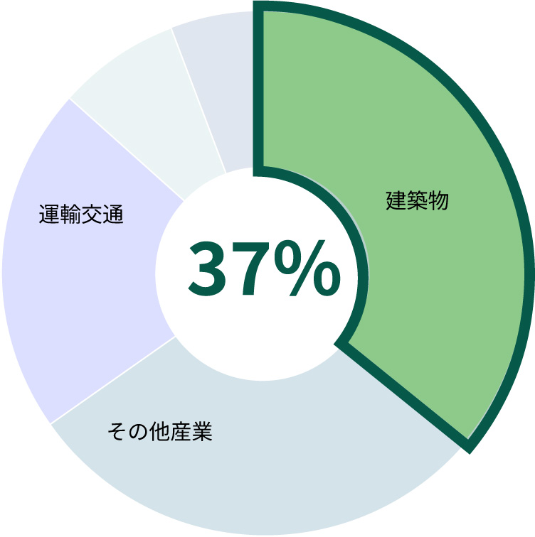 全世界平均で見ると、実は「建築物」がGHG総排出量の4割近くを占め、「その他産業」の3割、「運輸交通」の2割余を抑えてトップの座にいます。これは建築物に使われる建材を作るときに排出されるGHGに加えて、住宅やビルで使われる火力や電力の消費が多いからです。