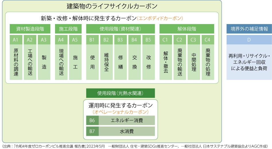 建築物に関わるGHG排出量は、建築材料のエンボディドカーボンよりも、実は冷暖房や調理などで使われるビルや住宅の使用時に使われる燃料や電力の消費による排出の方がはるかに大きいのです。この建築物を使用している時のGHG排出のことをオペレーショナルカーボンと称します。