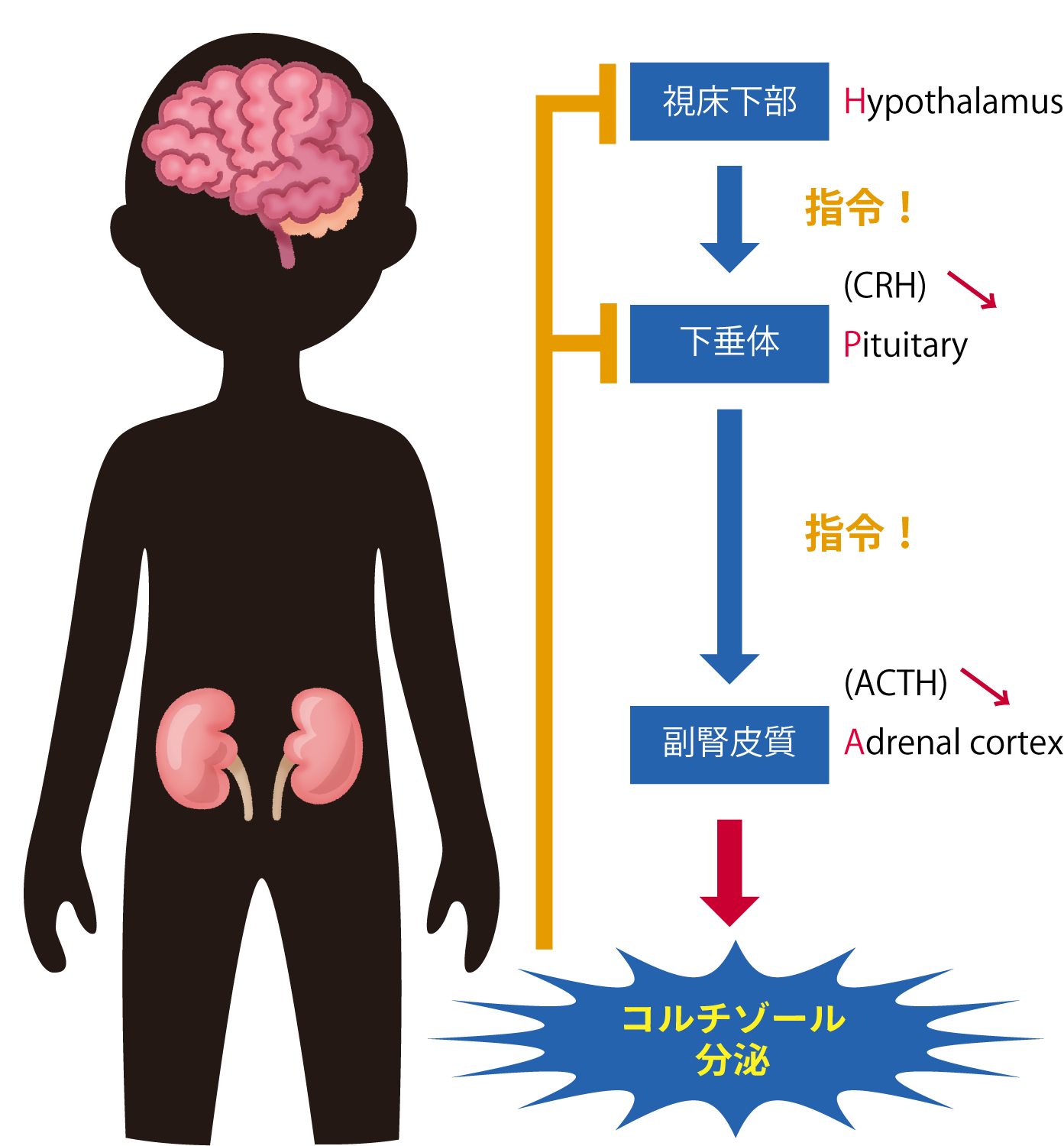 現代社会では、様々なストレスに直面することが多くなっています。このストレスへの対応に、セロトニンは重要な役割を果たしています。私たちの体には、ストレスに対応するための「HPA軸」と呼ばれるシステムが存在します。これは視床下部(脳の一部)が刺激を感知すると、下垂体(脳の下部にある器官)を活性化し、最終的に副腎皮質(腎臓の上にある器官)からストレスホルモン「コルチゾール」を分泌するという一連の流れで働きます。