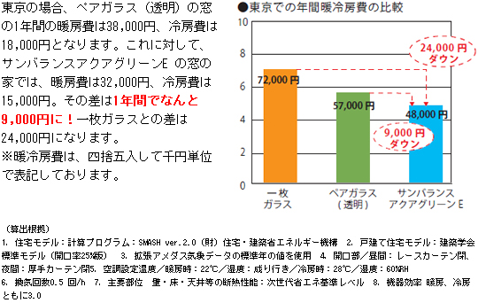 サンバランスアクアグリーンの窓の家では、暖房費は32000円、冷房費は15000円。ペアガラスとの差は1年間でなんと9000円に!一枚ガラスとの差は24000円になります。