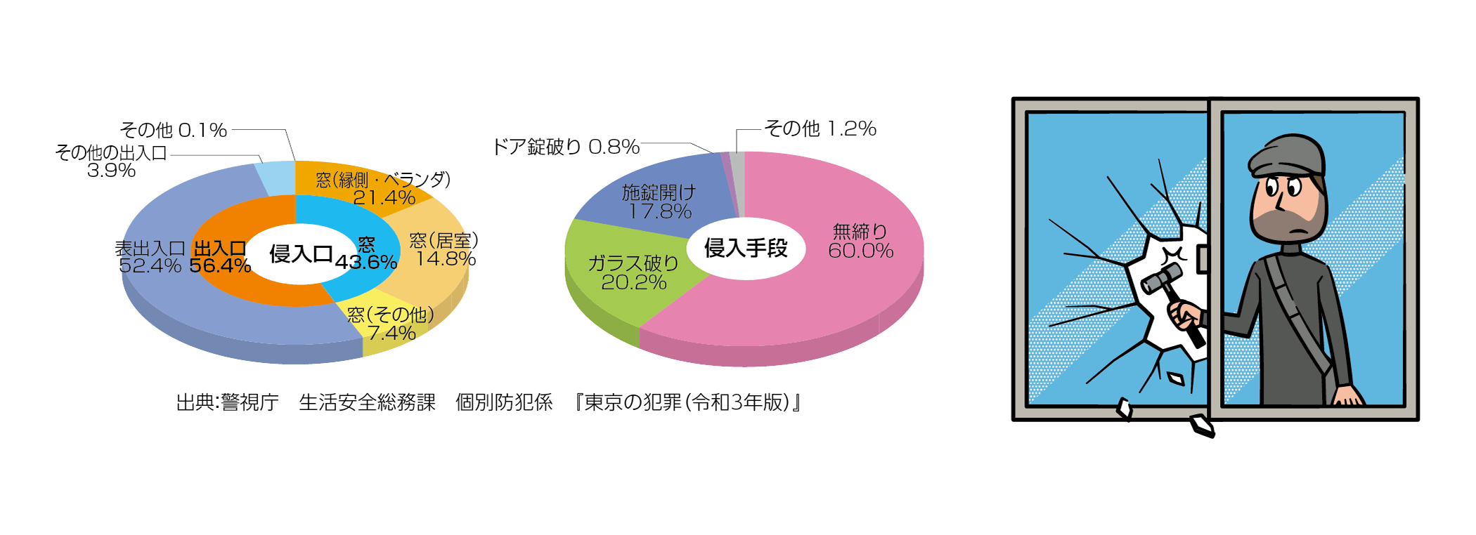 警視庁発表の『東京の犯罪(令和3年版)によると、住宅への侵入窃盗のうち、約44%が窓からの侵入です。また、侵入手段の約20%がガラス破りとなっており、安心な暮らしを実現するためには、窓ガラスの防犯対策が必要です。<ペアガラス セキュリティー>は、「防犯性能の高い建物部品の開発・普及に関する官民合同会議」で定められた試験に合格したCP認定品です。