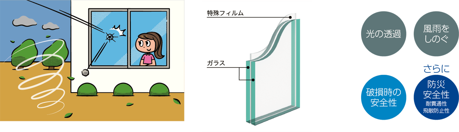 2枚のガラスで特殊なフィルムをはさんでいるため、ガラス片の飛散や貫通を抑えます。中間の特殊フィルムを厚くすることで、耐貫通性もより大きくなります。