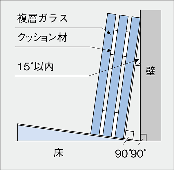 - ・複層ガラスを現場で保管する場合は、必ず直射日光を避け、風通しの良い室内に保管してください。また、保管時は図のような状態にしてください。