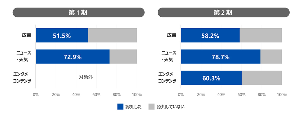 第一期、第二期を通じて、就業者の約55%が広告コンテンツを認知していることが判明しました。特に第二期では、コンテンツ数を2件から7件に増やしたことで、個々のコンテンツの認知度向上が確認されました。