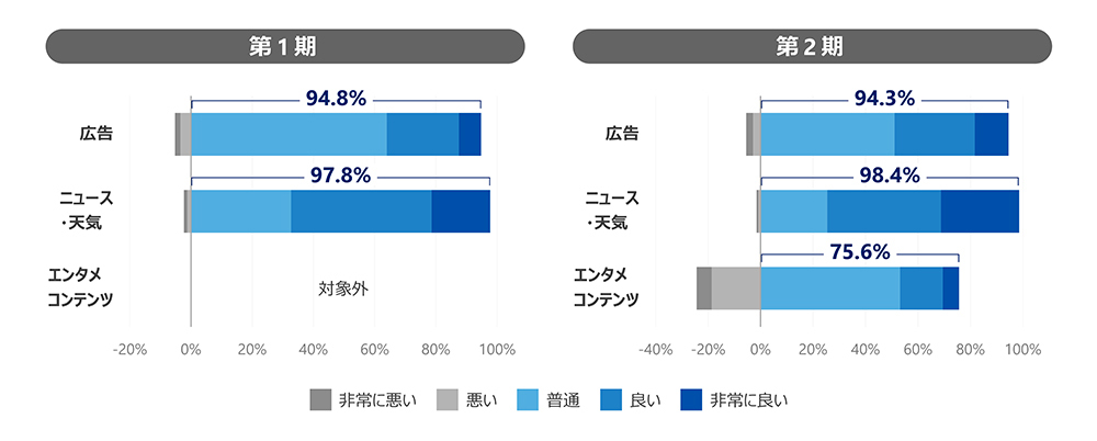 第一期、第二期を通じ、就業者における、広告、ニュース・天気に対する印象は、90%以上が「普通」、「良い」、「非常に良い」となりました。第二期ではコンテンツ数を増やしましたが、一般的な広告媒体においてしばしば見られるネガティブな反応の増加は確認されず、就業中に利用されるエリアでの広告放映の可能性が示唆されました。一方、ゲーム性を取り入れたエンタメコンテンツに関しては、受容性に課題が残る結果となりました。